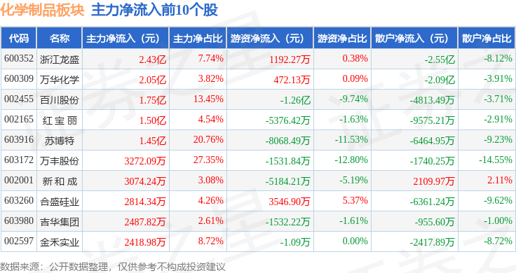 从资金流向上来看,当日化学制品板块主力资金净流出11.13亿元,游资资金净流入1.82亿元,散户资金净流入9.3亿元。化学制品板块个股资金流向见下表: