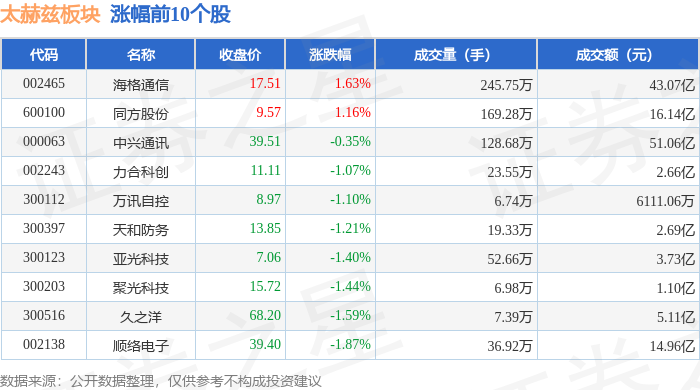 证券之星消息,1月29日太赫兹板块较上一交易日下跌2.13%,亨通光电领跌。当日上证指数报收于4157.98,上涨0.16%。深证成指报收于14300.08,下跌0.3%。太赫兹板块个股涨跌见下表: