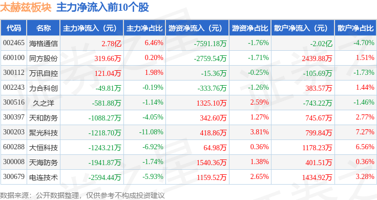从资金流向上来看,当日太赫兹板块主力资金净流出20.42亿元,游资资金净流入7082.63万元,散户资金净流入19.71亿元。太赫兹板块个股资金流向见下表: