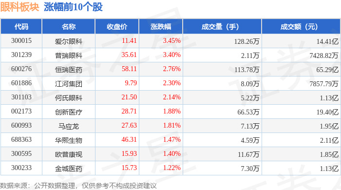 证券之星消息,1月29日眼科板块较上一交易日上涨1.46%,爱尔眼科领涨。当日上证指数报收于4157.98,上涨0.16%。深证成指报收于14300.08,下跌0.3%。眼科板块个股涨跌见下表: