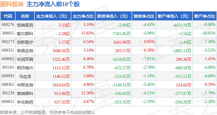 从资金流向上来看,当日眼科板块主力资金净流入5.15亿元,游资资金净流出3.04亿元,散户资金净流出2.11亿元。眼科板块个股资金流向见下表: