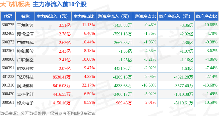 从资金流向上来看,当日大飞机板块主力资金净流出44.36亿元,游资资金净流入12.92亿元,散户资金净流入31.43亿元。大飞机板块个股资金流向见下表: