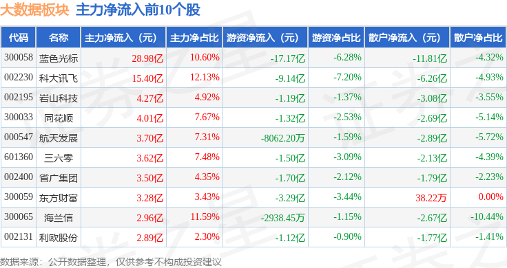 从资金流向上来看,当日大数据板块主力资金净流入65.94亿元,游资资金净流出43.55亿元,散户资金净流出22.39亿元。大数据板块个股资金流向见下表: