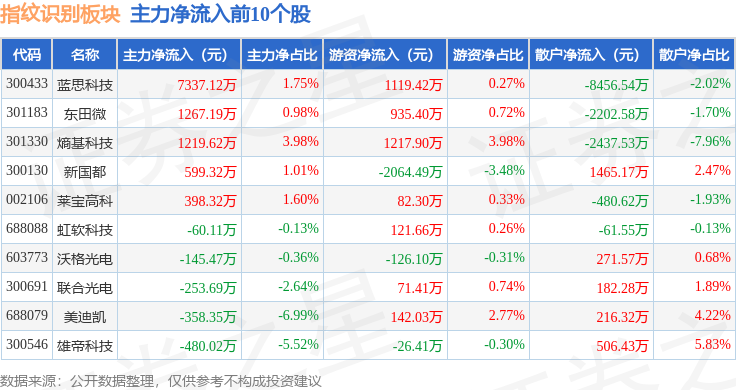从资金流向上来看,当日指纹识别板块主力资金净流出22.59亿元,游资资金净流入4.39亿元,散户资金净流入18.21亿元。指纹识别板块个股资金流向见下表: