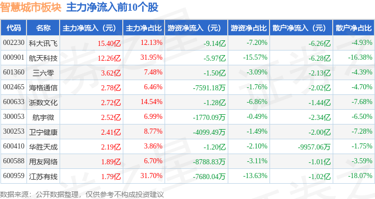 从资金流向上来看,当日智慧城市板块主力资金净流出73.44亿元,游资资金净流入11.53亿元,散户资金净流入61.9亿元。智慧城市板块个股资金流向见下表: