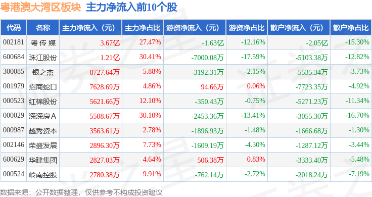 从资金流向上来看,当日粤港澳大湾区板块主力资金净流入2.26亿元,游资资金净流出3.3亿元,散户资金净流入1.04亿元。粤港澳大湾区板块个股资金流向见下表: