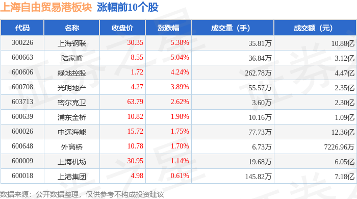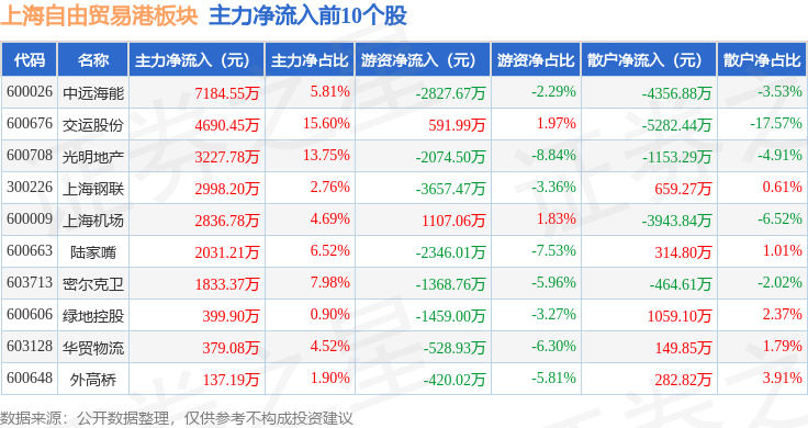 从资金流向上来看,当日上海自由贸易港板块主力资金净流出3.85亿元,游资资金净流入9307.98万元,散户资金净流入2.92亿元。上海自由贸易港板块个股资金流向见下表: