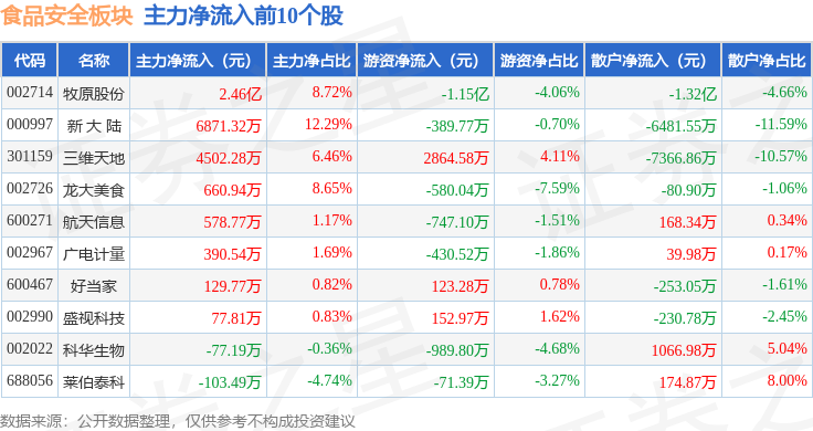 从资金流向上来看,当日食品安全板块主力资金净流出2.23亿元,游资资金净流入2309.54万元,散户资金净流入1.99亿元。食品安全板块个股资金流向见下表: