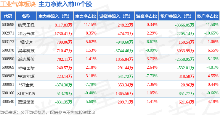 从资金流向上来看,当日工业气体板块主力资金净流出11.25亿元,游资资金净流入2.8亿元,散户资金净流入8.45亿元。工业气体板块个股资金流向见下表: