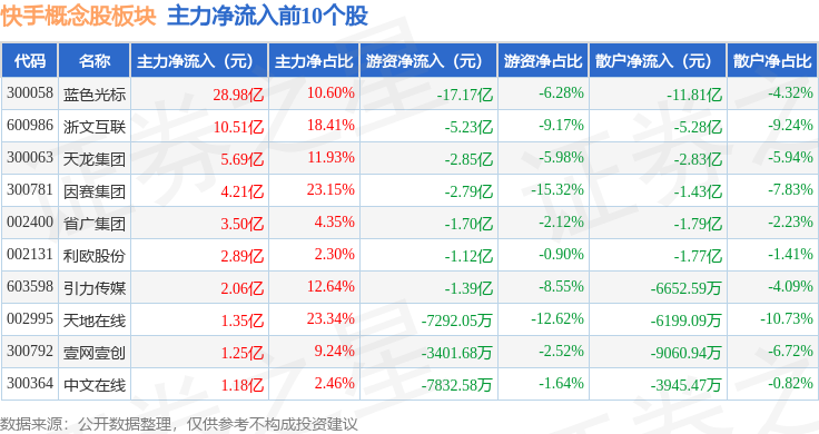 从资金流向上来看,当日快手概念股板块主力资金净流入59.82亿元,游资资金净流出36.11亿元,散户资金净流出23.7亿元。快手概念股板块个股资金流向见下表: