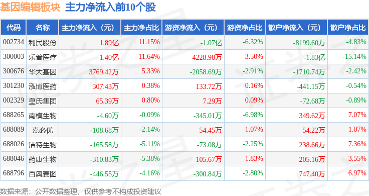 从资金流向上来看,当日基因编辑板块主力资金净流入1.1亿元,游资资金净流出8177.49万元,散户资金净流出2852.46万元。基因编辑板块个股资金流向见下表: