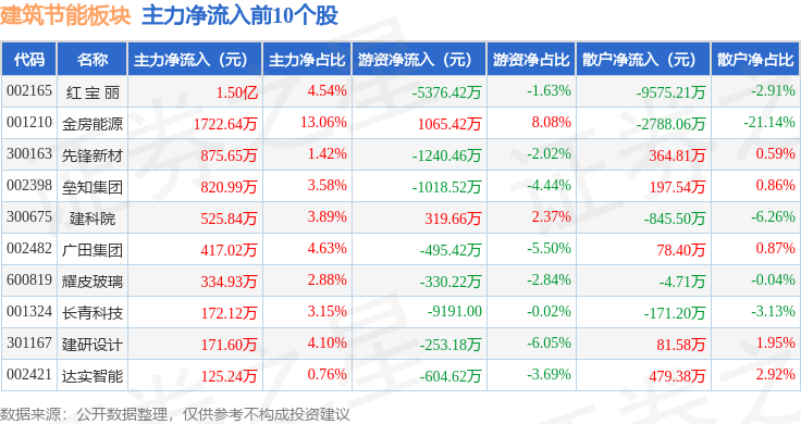 从资金流向上来看,当日建筑节能板块主力资金净流出422.69万元,游资资金净流出1.05亿元,散户资金净流入1.1亿元。建筑节能板块个股资金流向见下表: