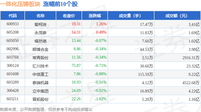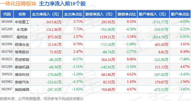 从资金流向上来看,当日一体化压铸板块主力资金净流出10.99亿元,游资资金净流入3.16亿元,散户资金净流入7.83亿元。一体化压铸板块个股资金流向见下表: