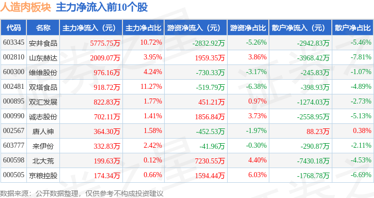 从资金流向上来看,当日人造肉板块主力资金净流出1.9亿元,游资资金净流入1.64亿元,散户资金净流入2601.47万元。人造肉板块个股资金流向见下表: