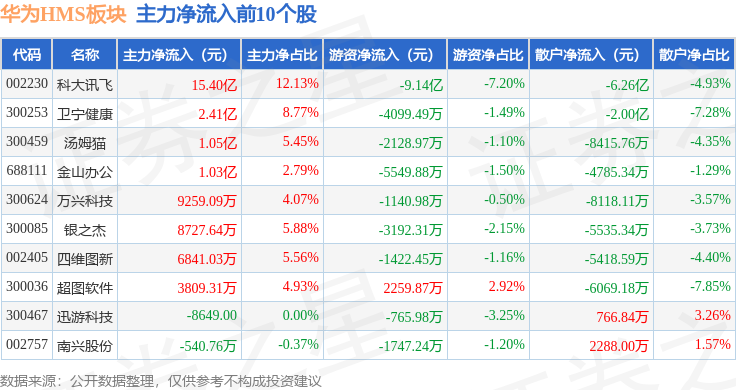 从资金流向上来看,当日华为HMS板块主力资金净流入20.77亿元,游资资金净流出11.19亿元,散户资金净流出9.59亿元。华为HMS板块个股资金流向见下表: