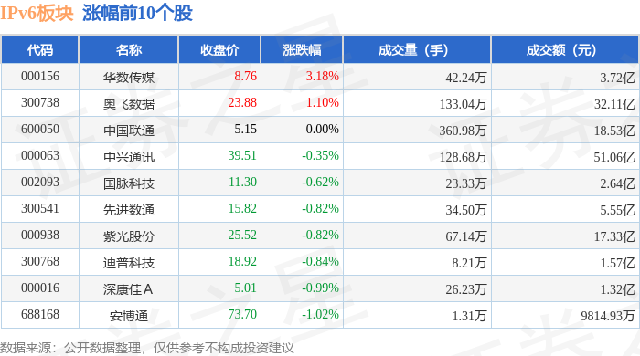 从资金流向上来看,当日IPv6板块主力资金净流出11.26亿元,游资资金净流入2.45亿元,散户资金净流入8.81亿元。IPv6板块个股资金流向见下表: