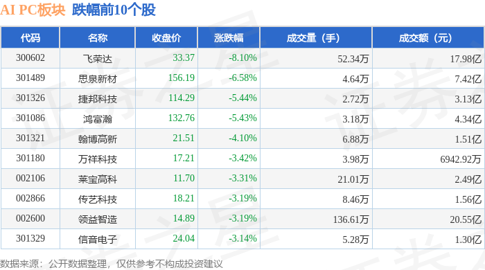 证券之星消息,1月29日AI PC板块较上一交易日下跌2.26%,飞荣达领跌。当日上证指数报收于4157.98,上涨0.16%。深证成指报收于14300.08,下跌0.3%。AI PC板块个股涨跌见下表: