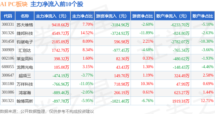 从资金流向上来看,当日AI PC板块主力资金净流出18.55亿元,游资资金净流入4.38亿元,散户资金净流入14.17亿元。AI PC板块个股资金流向见下表: