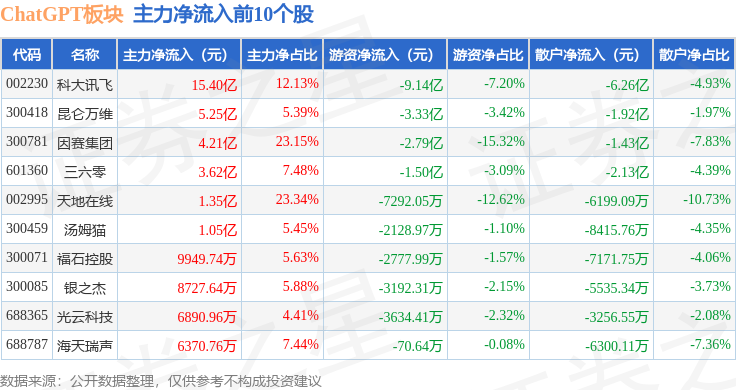 从资金流向上来看,当日ChatGPT板块主力资金净流出36.21亿元,游资资金净流入6.36亿元,散户资金净流入29.85亿元。ChatGPT板块个股资金流向见下表: