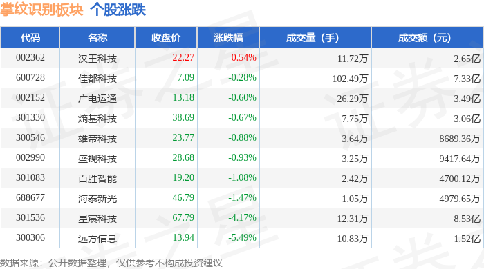 从资金流向上来看,当日掌纹识别板块主力资金净流出3090.33万元,游资资金净流出310.9万元,散户资金净流入3401.22万元。掌纹识别板块个股资金流向见下表: