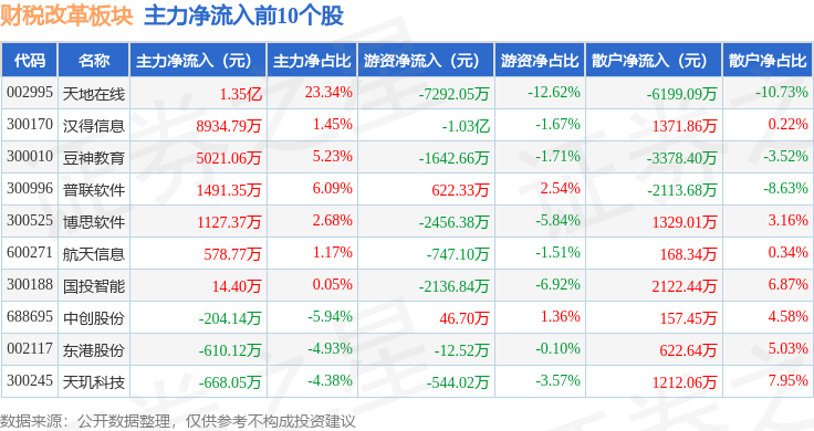 从资金流向上来看,当日财税改革板块主力资金净流出2.99亿元,游资资金净流出2.35亿元,散户资金净流入5.34亿元。财税改革板块个股资金流向见下表: