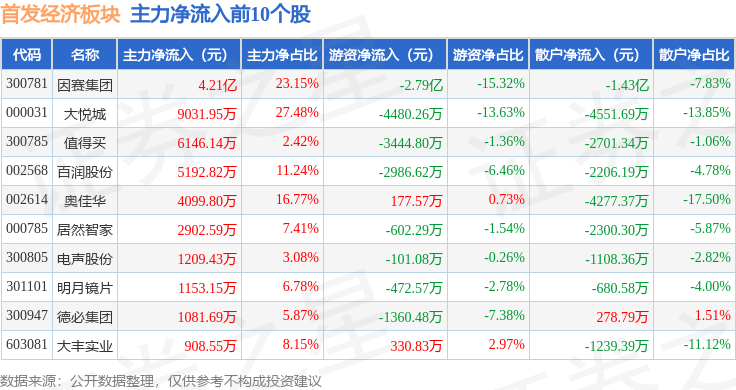 从资金流向上来看,当日首发经济板块主力资金净流入4.89亿元,游资资金净流出4.62亿元,散户资金净流出2646.07万元。首发经济板块个股资金流向见下表: