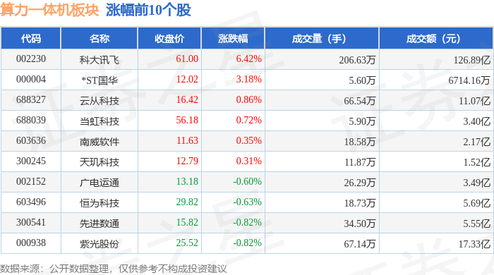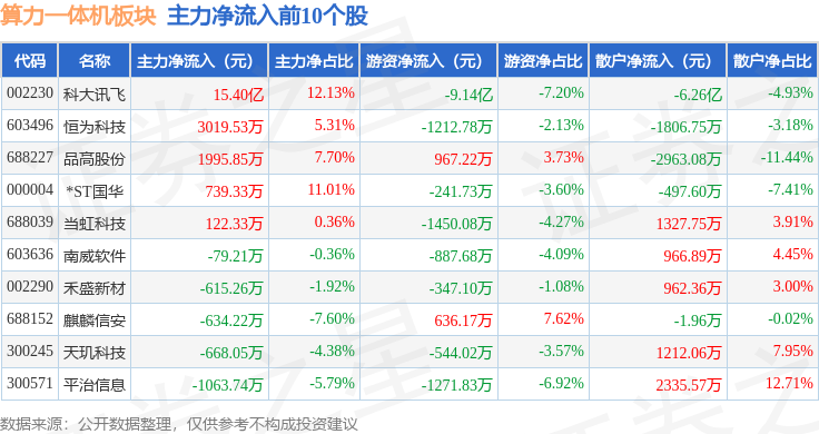 从资金流向上来看,当日算力一体机板块主力资金净流出16.3亿元,游资资金净流出1.05亿元,散户资金净流入17.35亿元。算力一体机板块个股资金流向见下表:
