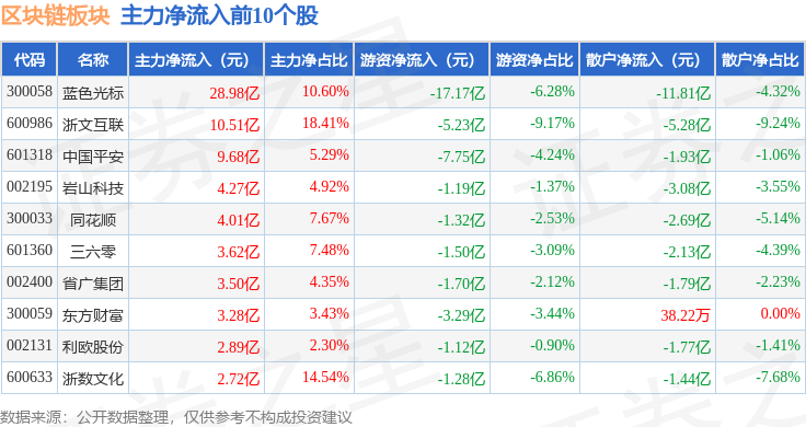 从资金流向上来看,当日区块链板块主力资金净流入50.52亿元,游资资金净流出49.36亿元,散户资金净流出1.16亿元。区块链板块个股资金流向见下表: