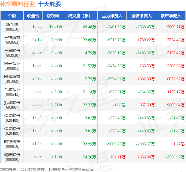 个股表现方面,化学原料行业当日领跌股为新金路(000510),该股当日报收16.63,下跌10.01%,成交量109.48万,主力资金净流出2401.26万元。三祥新材(603663)以下跌4.79%紧随其后,该股当日成交量23.88万,主力资金净流出9513.7万元。除此之外,三孚股份(603938)、惠云钛业(300891)、凯盛新材(301069)均进入当日熊股之列。具体个股列表见下表: