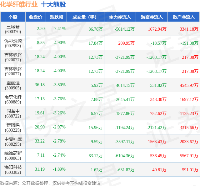 个股表现方面,化学纤维行业当日领跌股为三房巷(600370),该股当日报收2.5,下跌7.41%,成交量86.78万,主力资金净流出5014.12万元。优彩资源(002998)以下跌4.9%紧随其后,该股当日成交量17.84万,主力资金净流入209.95万元。除此之外,吉林碳谷(920077)、吉林碳谷(920077)、宝丽迪(300905)均进入当日熊股之列。具体个股列表见下表: