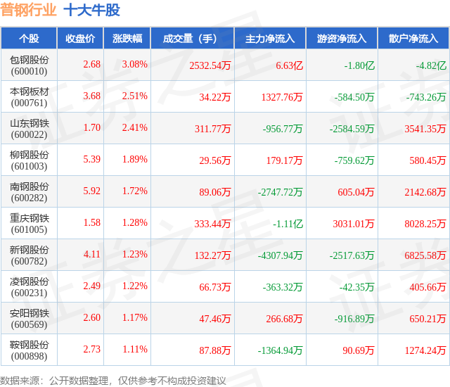 个股表现方面,普钢行业当日领涨股为包钢股份(600010),该股当日报收2.68,上涨3.08%,成交量2532.54万,主力资金净流入6.63亿元。本钢板材(000761)以上涨2.51%紧随其后,该股当日成交量34.22万,主力资金净流入1327.76万元。除此之外,山东钢铁(600022)、柳钢股份(601003)、南钢股份(600282)均进入当日牛股之列。具体个股列表见下表: