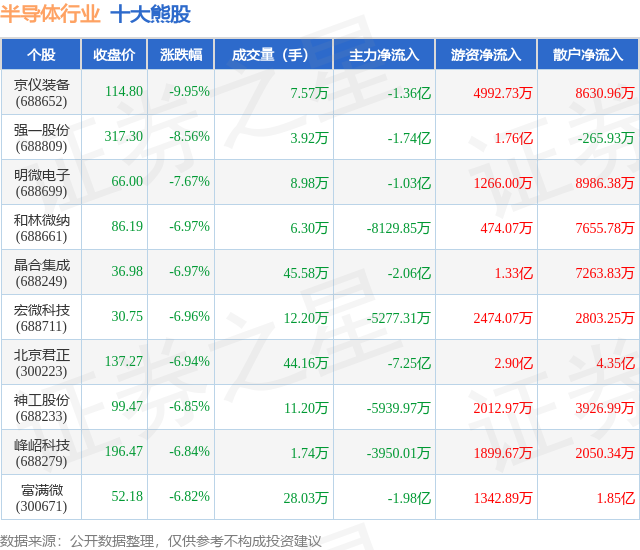 个股表现方面,半导体行业当日领跌股为京仪装备(688652),该股当日报收114.8,下跌9.95%,成交量7.57万,主力资金净流出1.36亿元。强一股份(688809)以下跌8.56%紧随其后,该股当日成交量3.92万,主力资金净流出1.74亿元。除此之外,明微电子(688699)、和林微纳(688661)、晶合集成(688249)均进入当日熊股之列。具体个股列表见下表: