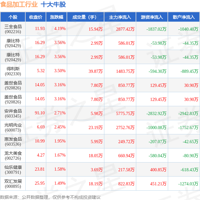 个股表现方面,食品加工行业当日领涨股为三全食品(002216),该股当日报收11.93,上涨4.19%,成交量15.94万,主力资金净流入2877.42万元。康比特(920429)以上涨3.56%紧随其后,该股当日成交量2.99万,主力资金净流入586.01万元。除此之外,康比特(920429)、得利斯(002330)、盖世食品(920826)均进入当日牛股之列。具体个股列表见下表: