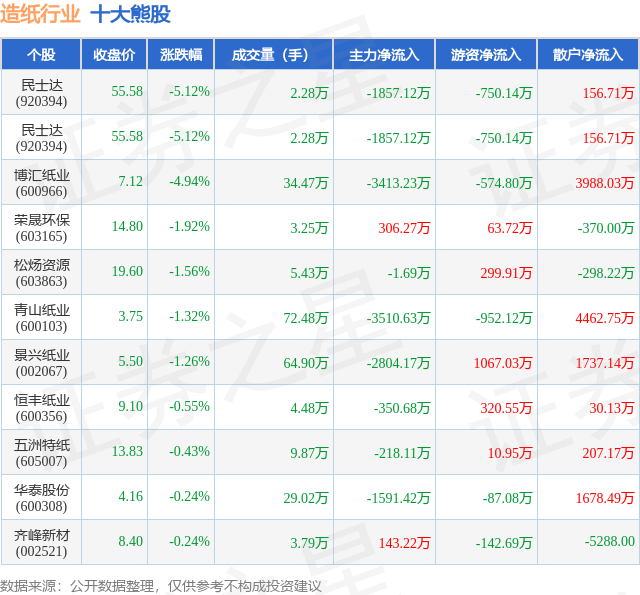 个股表现方面,造纸行业当日领跌股为民士达(920394),该股当日报收55.58,下跌5.12%,成交量2.28万,主力资金净流出1857.12万元。民士达(920394)以下跌5.12%紧随其后,该股当日成交量2.28万,主力资金净流出1857.12万元。除此之外,博汇纸业(600966)、荣晟环保(603165)、松炀资源(603863)均进入当日熊股之列。具体个股列表见下表: