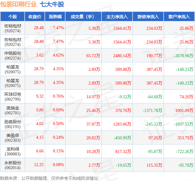 个股表现方面,包装印刷行业当日领涨股为宏裕包材(920274),该股当日报收28.48,上涨7.47%,成交量5.3万,主力资金净流入1564.41万元。宏裕包材(920274)以上涨7.47%紧随其后,该股当日成交量5.3万,主力资金净流入1564.41万元。除此之外,中锐股份(002374)、柏星龙(920075)、柏星龙(920075)均进入当日牛股之列。具体个股列表见下表: