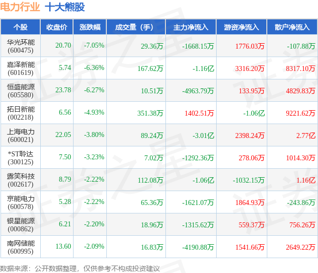 个股表现方面,电力行业当日领跌股为华光环能(600475),该股当日报收20.7,下跌7.05%,成交量29.36万,主力资金净流出1668.15万元。嘉泽新能(601619)以下跌6.36%紧随其后,该股当日成交量167.62万,主力资金净流出1.16亿元。除此之外,恒盛能源(605580)、拓日新能(002218)、上海电力(600021)均进入当日熊股之列。具体个股列表见下表: