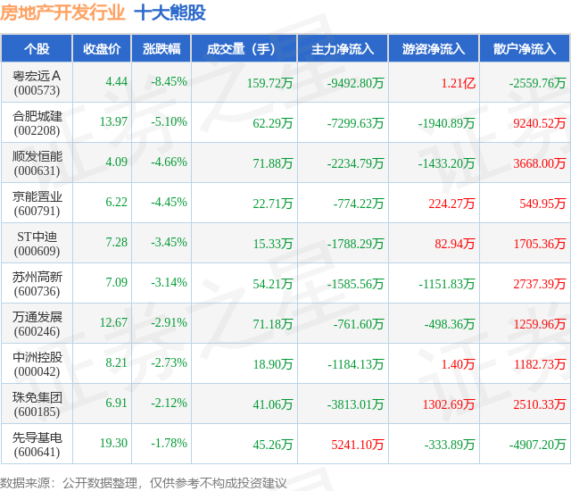 个股表现方面,房地产开发行业当日领跌股为粤宏远A(000573),该股当日报收4.44,下跌8.45%,成交量159.72万,主力资金净流出9492.8万元。合肥城建(002208)以下跌5.1%紧随其后,该股当日成交量62.29万,主力资金净流出7299.63万元。除此之外,顺发恒能(000631)、京能置业(600791)、ST中迪(000609)均进入当日熊股之列。具体个股列表见下表: