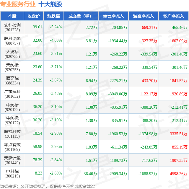 个股表现方面,专业服务行业当日领跌股为实朴检测(301228),该股当日报收39.61,下跌5.24%,成交量2.72万,主力资金净流出203.85万元。胜科纳米(688757)以下跌4.85%紧随其后,该股当日成交量3.81万,主力资金净流出1934.44万元。除此之外,天纺标(920753)、天纺标(920753)、西高院(688334)均进入当日熊股之列。具体个股列表见下表: