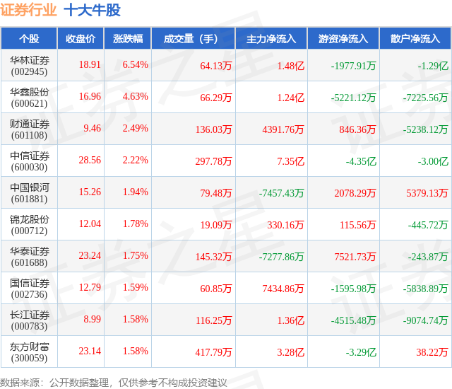 个股表现方面,证券行业当日领涨股为华林证券(002945),该股当日报收18.91,上涨6.54%,成交量64.13万,主力资金净流入1.48亿元。华鑫股份(600621)以上涨4.63%紧随其后,该股当日成交量66.29万,主力资金净流入1.24亿元。除此之外,财通证券(601108)、中信证券(600030)、中国银河(601881)均进入当日牛股之列。具体个股列表见下表: