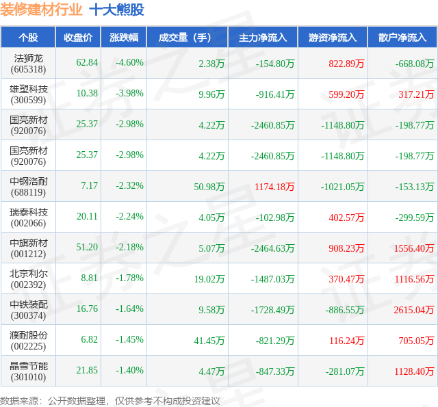 个股表现方面,装修建材行业当日领跌股为法狮龙(605318),该股当日报收62.84,下跌4.6%,成交量2.38万,主力资金净流出154.8万元。雄塑科技(300599)以下跌3.98%紧随其后,该股当日成交量9.96万,主力资金净流出916.41万元。除此之外,国亮新材(920076)、国亮新材(920076)、中钢洛耐(688119)均进入当日熊股之列。具体个股列表见下表: