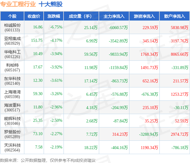 个股表现方面,专业工程行业当日领跌股为柏诚股份(601133),该股当日报收16.86,下跌6.75%,成交量25.14万,主力资金净流出6060.57万元。亚翔集成(603929)以下跌4.17%紧随其后,该股当日成交量6.99万,主力资金净流出3542.89万元。除此之外,华电科工(601226)、利柏特(605167)、东华科技(002140)均进入当日熊股之列。具体个股列表见下表: