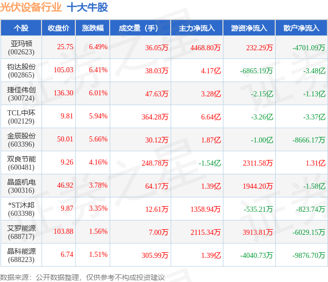 个股表现方面,光伏设备行业当日领涨股为亚玛顿(002623),该股当日报收25.75,上涨6.49%,成交量36.05万,主力资金净流入4468.8万元。钧达股份(002865)以上涨6.41%紧随其后,该股当日成交量38.03万,主力资金净流入4.17亿元。除此之外,捷佳伟创(300724)、TCL中环(002129)、金辰股份(603396)均进入当日牛股之列。具体个股列表见下表: