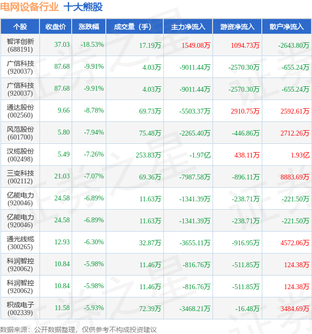 个股表现方面,电网设备行业当日领跌股为智洋创新(688191),该股当日报收37.03,下跌18.53%,成交量17.19万,主力资金净流入1549.08万元。广信科技(920037)以下跌9.91%紧随其后,该股当日成交量4.03万,主力资金净流出9011.44万元。除此之外,广信科技(920037)、通达股份(002560)、风范股份(601700)均进入当日熊股之列。具体个股列表见下表: