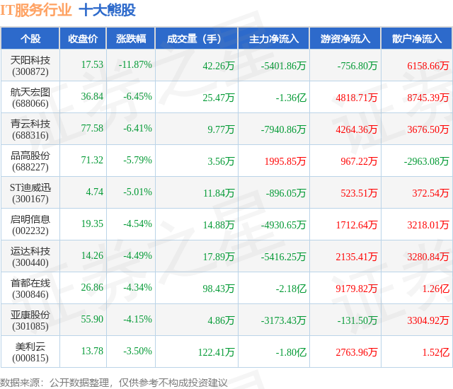 个股表现方面,IT服务行业当日领跌股为天阳科技(300872),该股当日报收17.53,下跌11.87%,成交量42.26万,主力资金净流出5401.86万元。航天宏图(688066)以下跌6.45%紧随其后,该股当日成交量25.47万,主力资金净流出1.36亿元。除此之外,青云科技(688316)、品高股份(688227)、ST迪威迅(300167)均进入当日熊股之列。具体个股列表见下表: