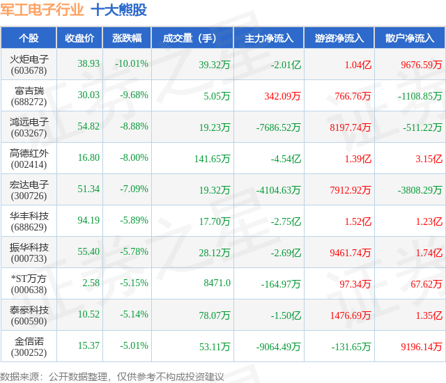 个股表现方面,军工电子行业当日领跌股为火炬电子(603678),该股当日报收38.93,下跌10.01%,成交量39.32万,主力资金净流出2.01亿元。富吉瑞(688272)以下跌9.68%紧随其后,该股当日成交量5.05万,主力资金净流入342.09万元。除此之外,鸿远电子(603267)、高德红外(002414)、宏达电子(300726)均进入当日熊股之列。具体个股列表见下表: