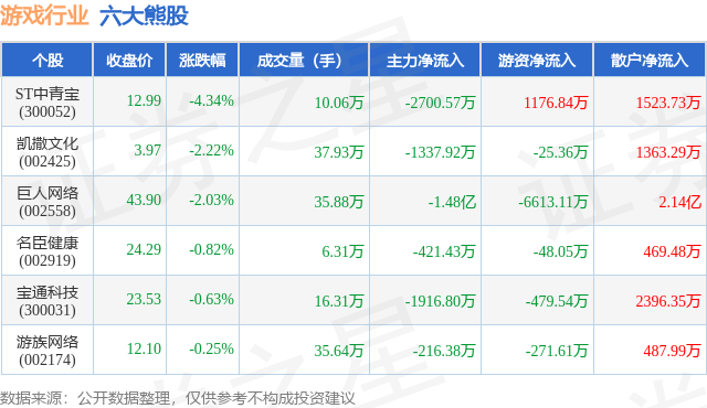 个股表现方面,游戏行业当日领跌股为ST中青宝(300052),该股当日报收12.99,下跌4.34%,成交量10.06万,主力资金净流出2700.57万元。凯撒文化(002425)以下跌2.22%紧随其后,该股当日成交量37.93万,主力资金净流出1337.92万元。除此之外,巨人网络(002558)、名臣健康(002919)、宝通科技(300031)均进入当日熊股之列。具体个股列表见下表: