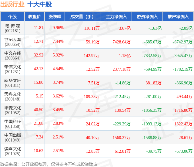 个股表现方面,出版行业当日领涨股为粤 传 媒(002181),该股当日报收11.81,上涨9.96%,成交量116.11万,主力资金净流入3.67亿元。世纪天鸿(300654)以上涨7.44%紧随其后,该股当日成交量59.19万,主力资金净流入7428.64万元。除此之外,中文在线(300364)、荣信文化(301231)、新华文轩(601811)均进入当日牛股之列。具体个股列表见下表: