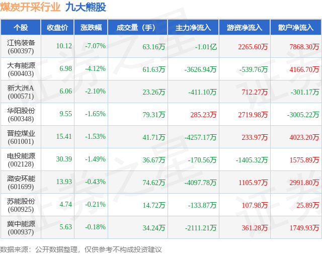 个股表现方面,煤炭开采行业当日领跌股为江钨装备(600397),该股当日报收10.12,下跌7.07%,成交量63.16万,主力资金净流出1.01亿元。大有能源(600403)以下跌4.12%紧随其后,该股当日成交量61.63万,主力资金净流出3626.94万元。除此之外,新大洲A(000571)、华阳股份(600348)、晋控煤业(601001)均进入当日熊股之列。具体个股列表见下表: