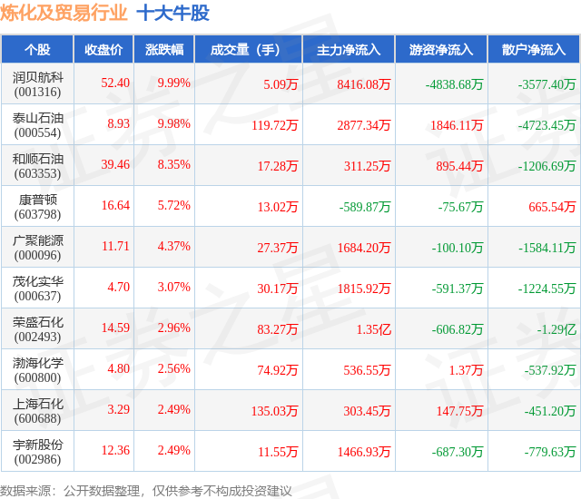 个股表现方面,炼化及贸易行业当日领涨股为润贝航科(001316),该股当日报收52.4,上涨9.99%,成交量5.09万,主力资金净流入8416.08万元。泰山石油(000554)以上涨9.98%紧随其后,该股当日成交量119.72万,主力资金净流入2877.34万元。除此之外,和顺石油(603353)、康普顿(603798)、广聚能源(000096)均进入当日牛股之列。具体个股列表见下表: