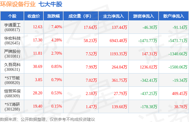 个股表现方面,环保设备行业当日领涨股为宇通重工(600817),该股当日报收12.63,上涨7.4%,成交量17.64万,主力资金净流入137.44万元。华宏科技(002645)以上涨4.28%紧随其后,该股当日成交量58.23万,主力资金净流入6943.48万元。除此之外,严牌股份(301081)、久吾高科(300631)、*ST节能(000820)均进入当日牛股之列。具体个股列表见下表: